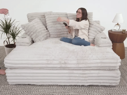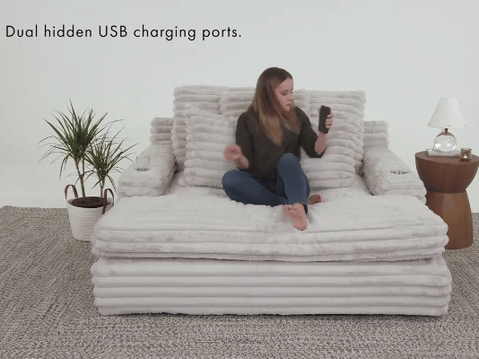 Click on "BUY NOW" to get yours now!Our chaise lounge is the perfect addition to your living room for ultimate relaxation. Its ultra-dense, soft luxurious feel is made with wide, super soft corduroy fabric that is both durable and stylish. The chaise lounge has a lofty appearance and is accompanied by three back pillows and two down filled toss pillows for added comfort. With two USB ports, you can conveniently charge your electronic devices while lounging. And with two cupholders, you can easily enjoy your favorite beverage without having to get up. Whether you are watching a movie or reading a book, our Chaise Lounge is the perfect spot to unwind and relax.Product DescriptionThe name says it all!! This chaise is perfect to nestle into with a book or a cup of coffee, or for a nap. It’s also nice and roomy, so you can spread out as much as you want. It’s even sizable enough for two people to sit together and watch TV.Measurements